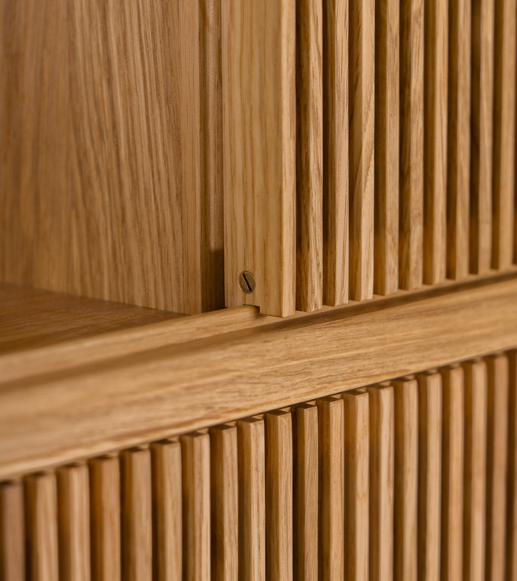 The handcrafted sliding panels, made from individually cut oak slats, do more than just catch the eye – they let you create your own visual rhythm: part open, part closed, depending on function and mood. You decide what to display and what to subtly hide.