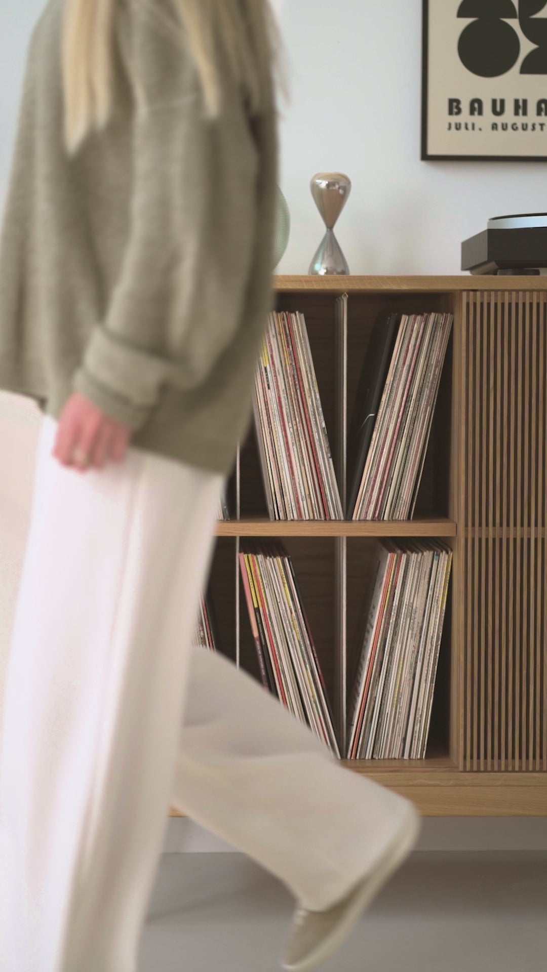 A modern wooden sideboard with lamps, books, and a record player, with abstract wall art above, in a minimal living room.A person in a brown sweater and gray sneakers opens a drawer in a wooden cabinet filled with CDs.