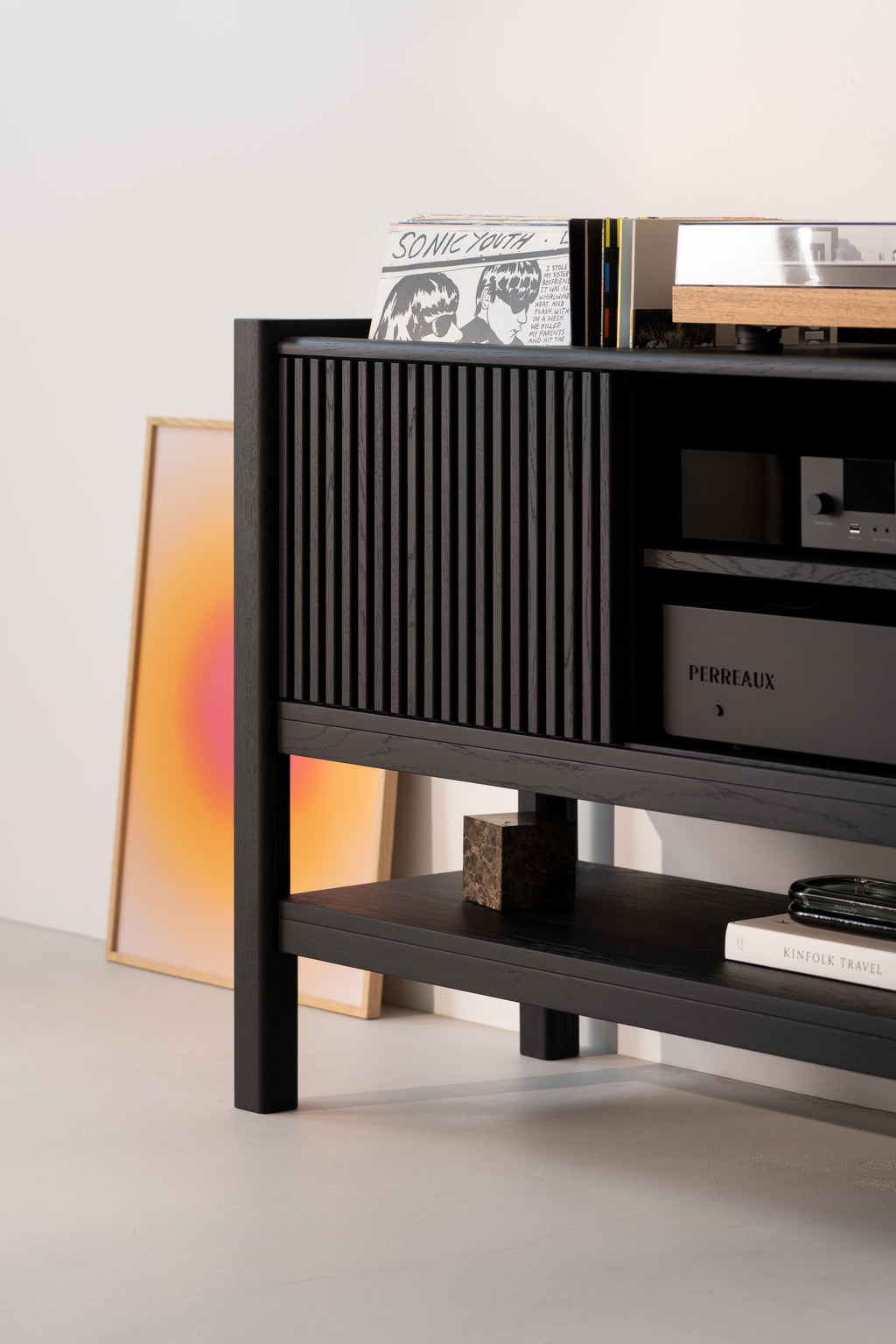 Alt du trenger på ett sted. Toppen gir plass til en platespiller, en innebygd flip-box for favorittalbumene dine og et avtakbart stativ for de fem platene du spiller oftest. Inne i korpuset finnes en justerbar, vibrasjonsdempende hylle med utskjæring for kabler som stabiliserer lydutstyret ditt. En push-to-open skuff med soft close rommer CD-er og tilbehør. Den skyvbare lamellfronten laget av håndskårne eikelister sørger for naturlig ventilasjon og lar deg styre utstyret med fjernkontroll uten å åpne fronten.