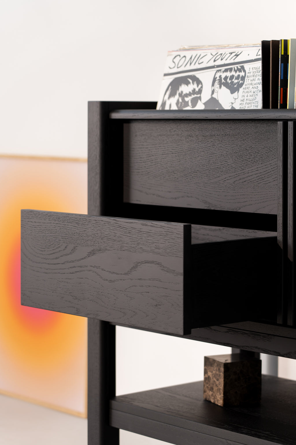 JAMM 111 er et kompakt og svært funksjonelt audiomøbel laget av massiv eik, beiset i en dyp, matt svart farge. Designet for elskere av moderne minimalisme, kombinerer det elegant plass til platespiller, Hi-Fi-komponenter og vinylsamling i én raffinert form. Den enkle, geometriske silhuetten passer sømløst inn i interiører inspirert av Japandi- og modern classic-stilene. Den vannbaserte lakken i utslippsklasse A+ er miljøvennlig, trygg og gir overflaten en subtil, silkemyk matt glans.
