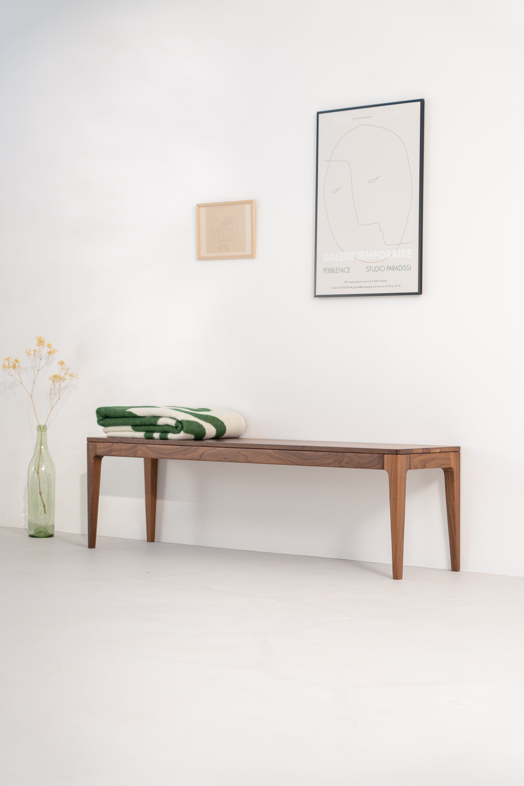 We make the table and bench from solid American walnut, selected for stability and a consistent, attractive grain. The surface is finished with a natural blend of oils and waxes. It protects the wood in daily use while highlighting its deep color and giving it a subtle satin sheen.