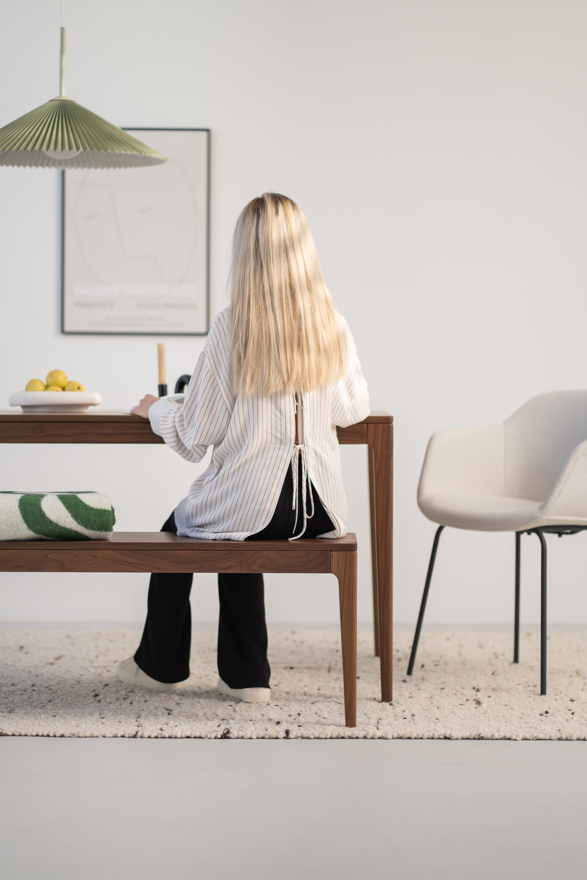 The set is available in five standard sizes, always with a bench proportioned to the table length. HYGG in walnut works beautifully in a dining room or kitchen, and also looks right at home in an elegant office space where material quality and function matter.