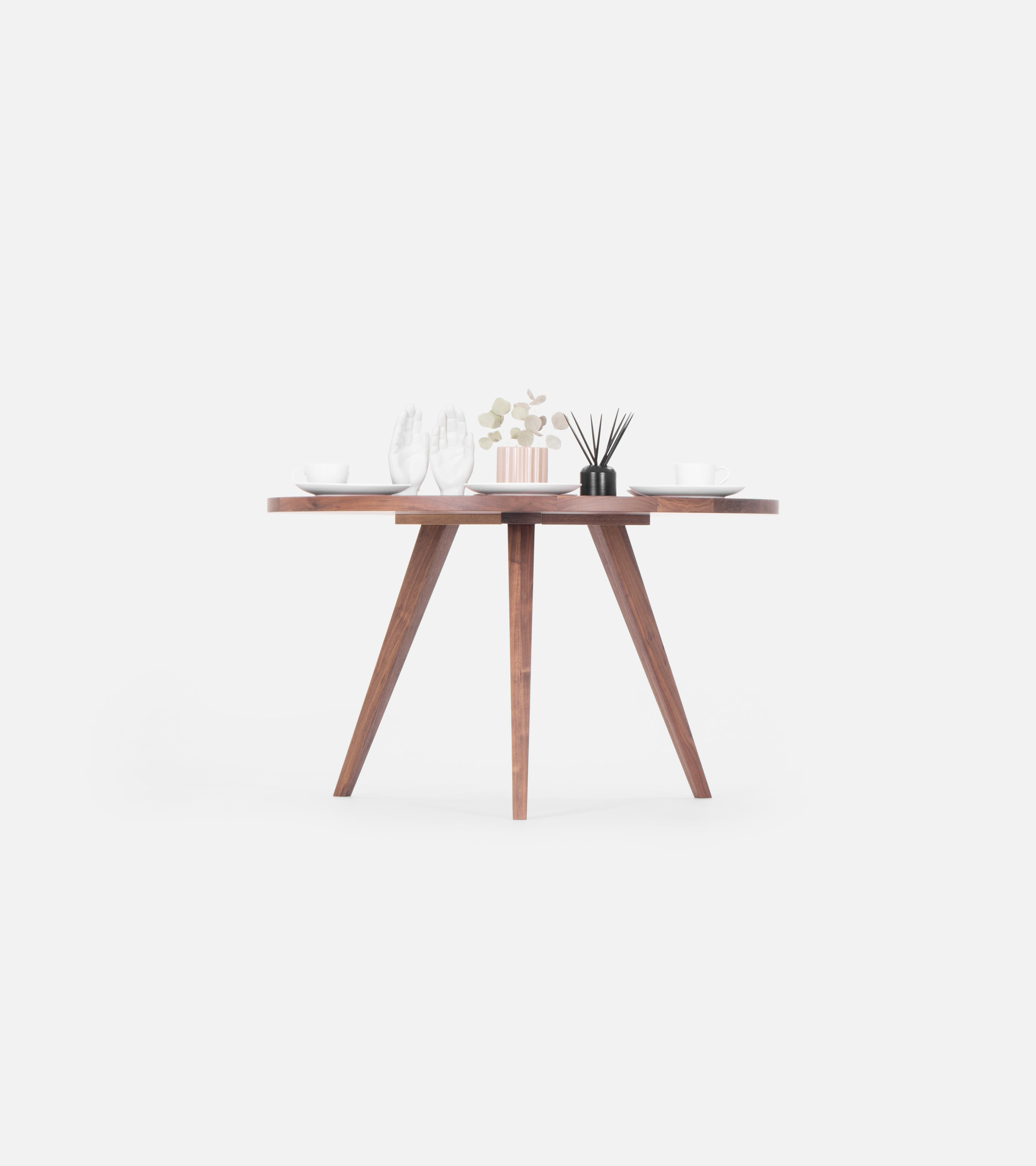 It is a choice for those who seek solid wood furniture where every detail is refined for daily comfort. The round silhouette naturally invites conversation and fits beautifully even in more intimate spaces. Hand-selected walnut wood captivates with its unique grain, while the substantial thickness of the tabletop ensures durability for generations. The softly finished edges are a subtle detail you will feel and appreciate every single day.