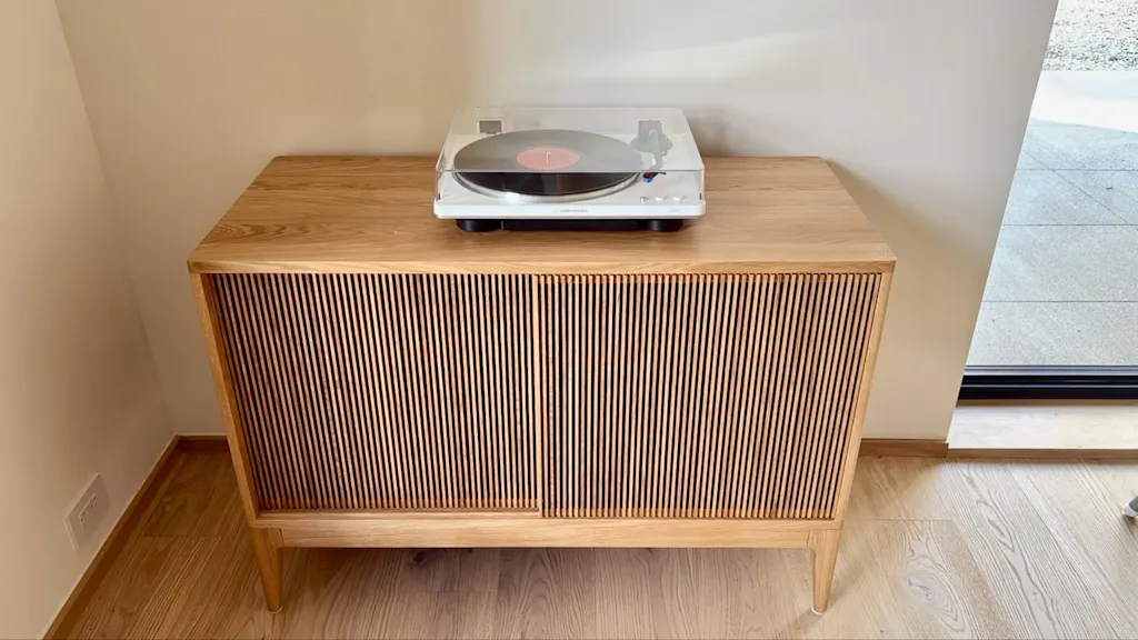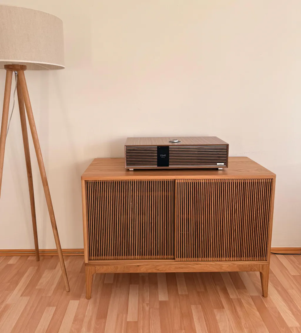 In designing this audio cabinet, we drew inspiration from mid-century modern and Japandi styles. The piece will fit seamlessly into both industrial loft interiors and warmer, cozier spaces.