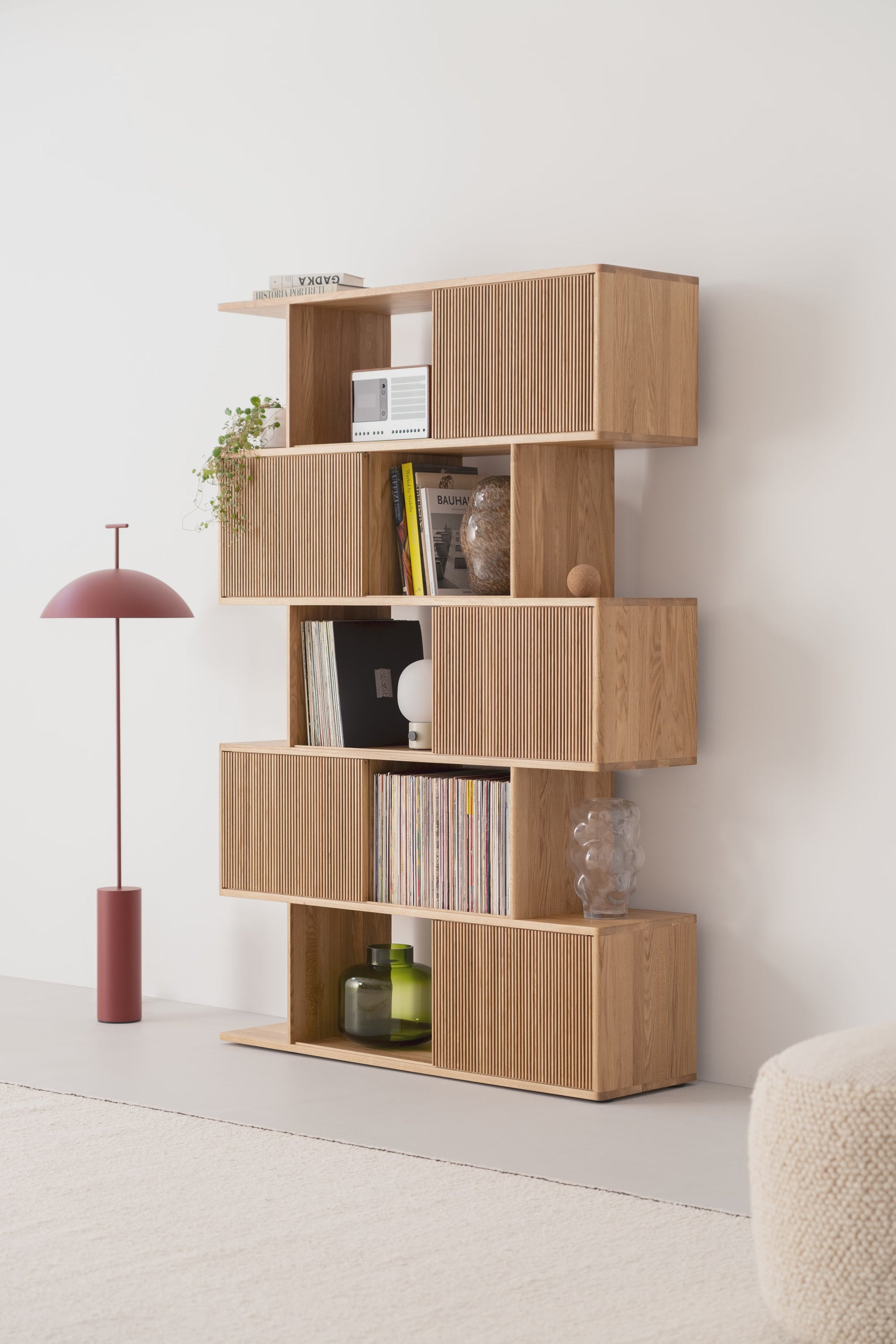 Tio rymliga, stadigt fastsatta hyllor ger gott om plats för böcker, vinylskivor, dekorationer eller vardagliga nödvändigheter. Stycket är stabilt, hållbart och fungerar lika bra som en funktionell förvaringsenhet och en slående designdetalj.